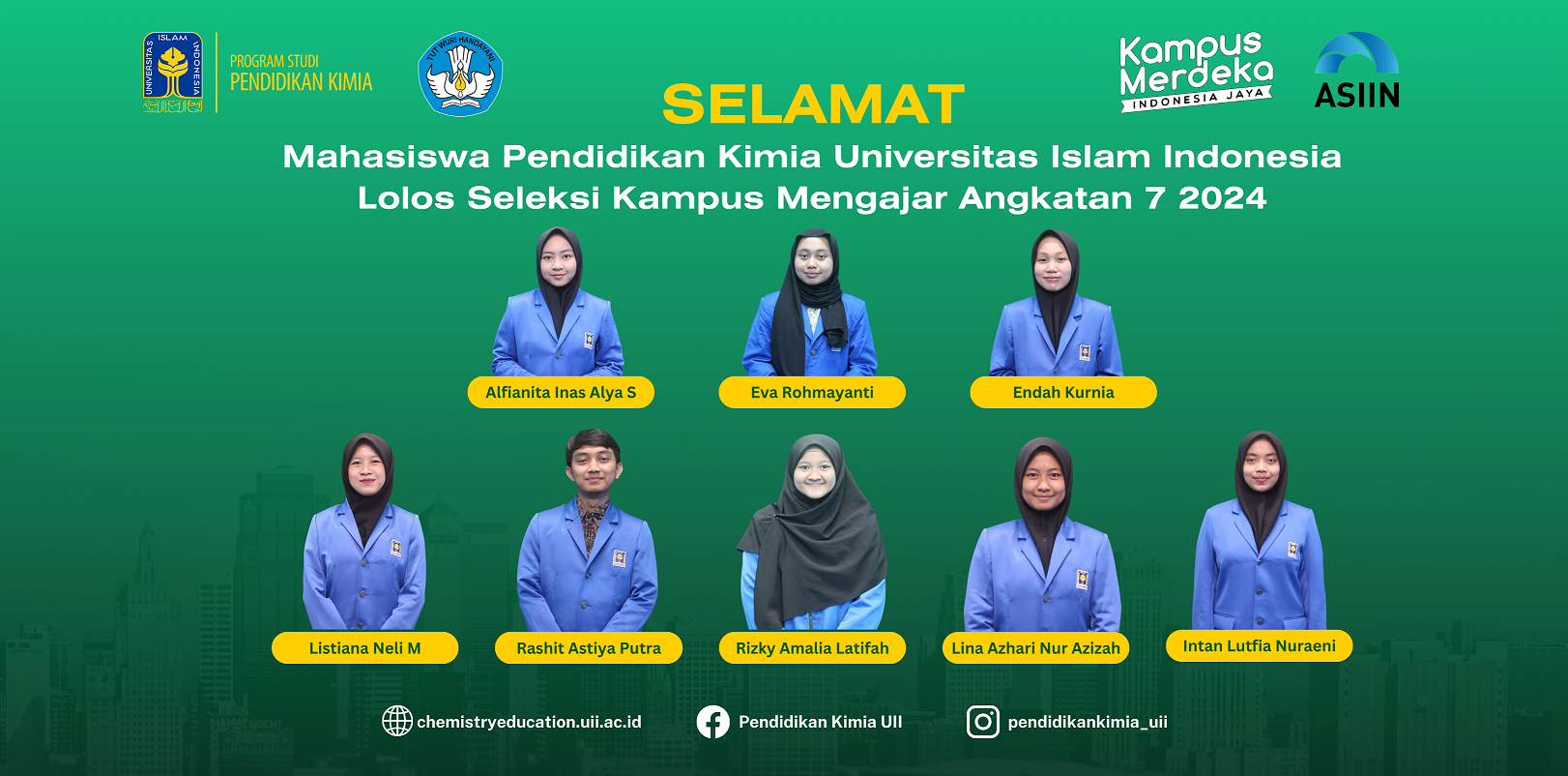 Program Kampus Mengajar Angkatan 7 ini dilaksankan selama mulai bulan Februari hingga Juni 2024. Setelah melalui tahap seleksi yang komprehensif, para mahasiswa Pendidikan Kimia Universitas Islam Indonesia berikut telah berhasil meraih tempat untuk melaksanakan Program Kampus Mengajar Angkatan 7: