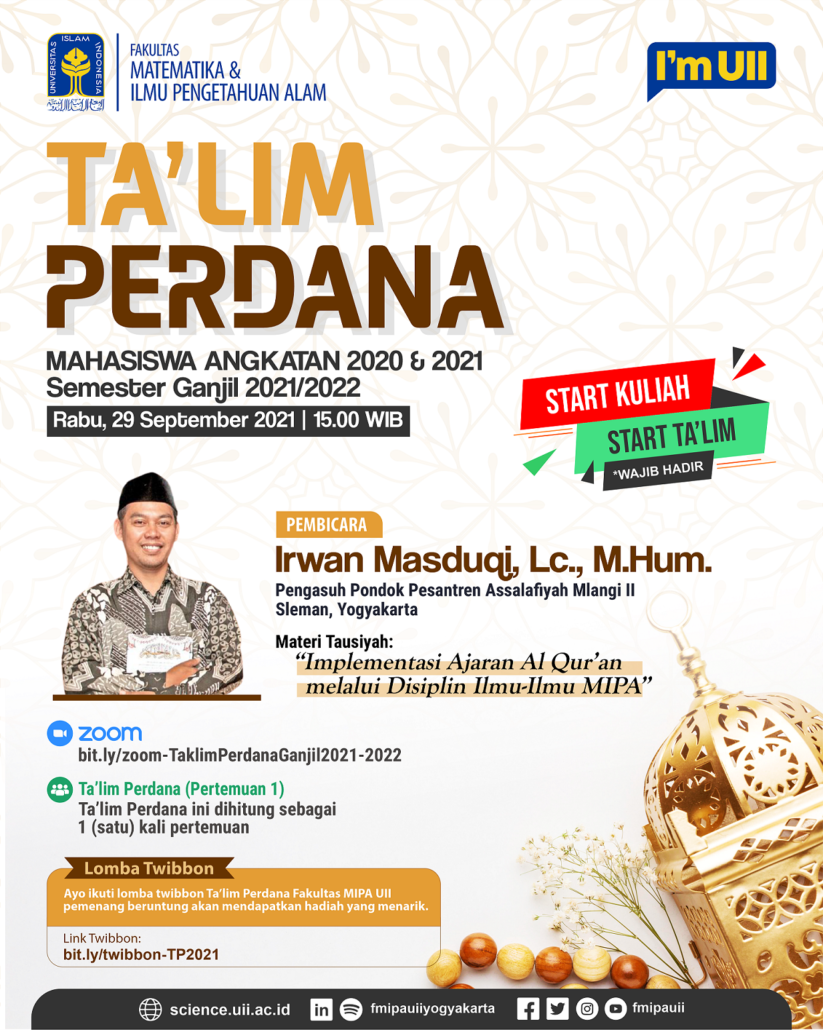 Mengawali kegiatan Ta’lim di Semester Ganjil T.A. 2021/2022, Fakultas MIPA UII menyelenggarakan Ta’lim Perdana Mahasiswa Angkatan 2020 & 2021 Semester Ganjil T.A. 2021/2022. Kegiatan ini akan dilaksanakan pada Rabu, 29 September 2021 Pukul 15.00 WIB secara daring melalui Zoom Meeting. Acara ini akan dibersamai oleh Ust. Irwan Masduqi, Lc., M.Hum, yang merupakan pengasuh Pondok Pesantren Assalafiyah II Mlangi, Sleman Yogyakarta dengan materi berjudul ” Implementasi Ajaran Al Qur’an melalui Disiplin Ilmu-Ilmu MIPA”.